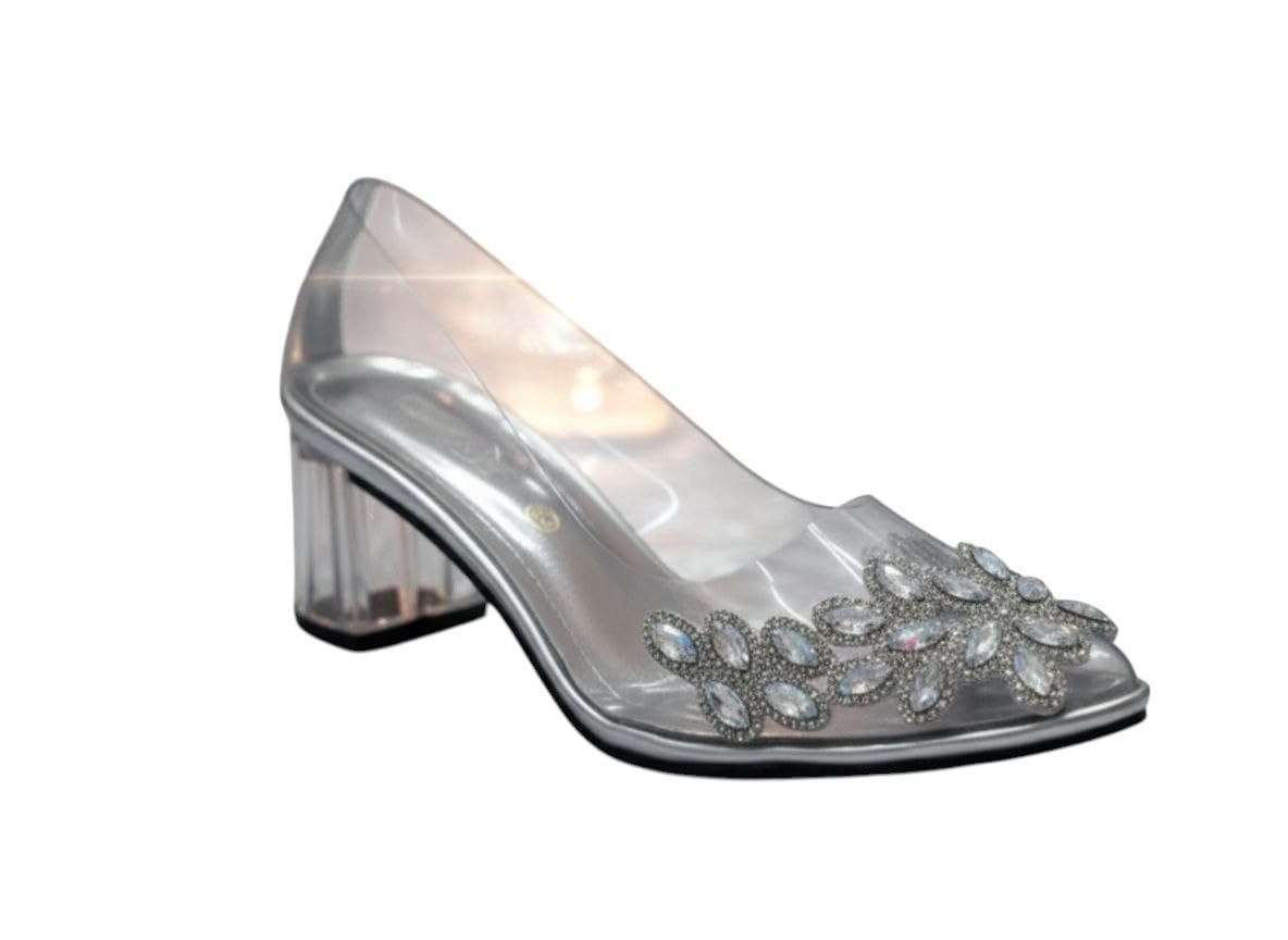 هيلزنسائي شفاف بكعب سميك مزين بأحجار كريستال لامعة، جزمه للسيدات كعب 5سم للسيدات