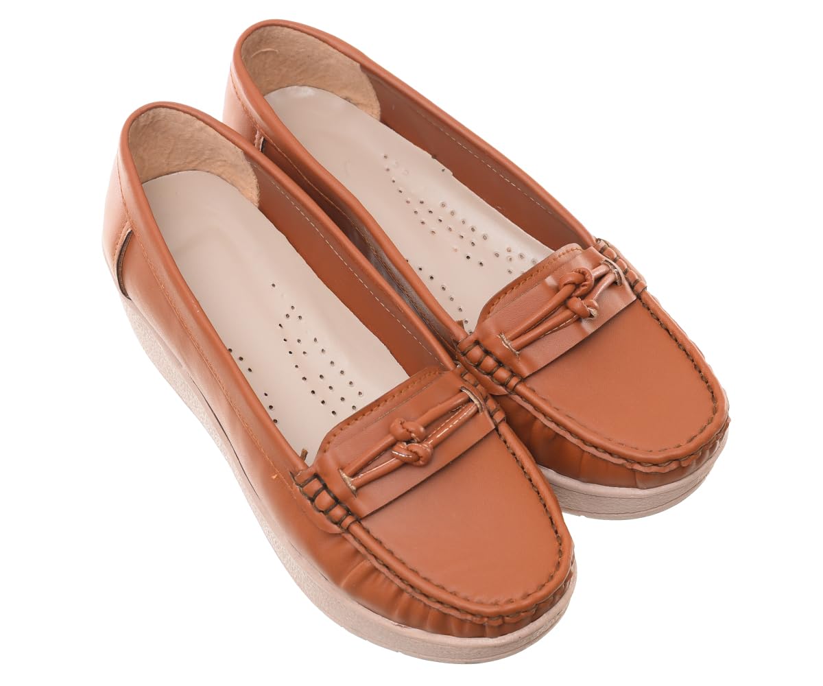 These women’s leather loafers combine timeless style with everyday comfort. Crafted with a classic moccasin design, these shoes feature elegant decorative bow detailing on the front that adds a sophisticated touch to any outfit. The rich tan leather upper showcases quality craftsmanship with meticulous stitching along the edges, whilst the slip-on design ensures effortless wear for busy days. The chunky block heel provides a subtle lift whilst maintaining stability and all-day wearability, making these loafers perfect for both casual outings and smart-casual occasions. Inside, the cushioned insole with perforated ventilation holes keeps your feet comfortable throughout the day, whilst the soft lining prevents rubbing and irritation. The lightweight platform sole offers excellent grip and durability for extended wear. These versatile loafers pair beautifully with trousers, skirts, or dresses, transitioning seamlessly from office to weekend activities. The neutral tan colour complements a wide range of wardrobe choices, making these shoes a practical addition to any collection. Please check the sizing chart carefully before ordering to ensure the perfect fit.