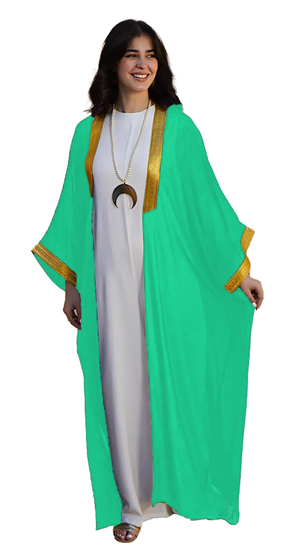 Our classic Sun Sitabaya Kaftan is back in new colors made of chiffon with a contrast embroidered gold belt on the front and above the sleeves. Easy to match with high waist pants, basic shirt, heels and matching bag. Gold Embroidery Sheer Chiffon Fabric Open Front Bisht One Size Fits All From 45K to 110K Great Material – Soft and Breathable Chiffon. Don’t worry about getting hot with it. Chiffon fabric makes you cool in the hot day. You will feel soft and lightweight when you wear it.